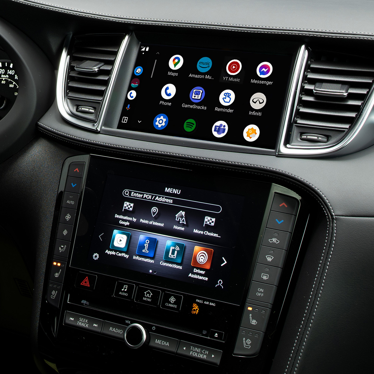 The INFINITI names, logos and slogans are trademarks owned by or licensed to Nissan Motor Co. Ltd. or its North American subsidiaries. Other trademarks and trade names are those of their respective owners. Google, Android, YouTube, Android Auto and other marks are trademarks of Google LLC. Compatible Android phone and compatible active data plan required. Apple CarPlay is a trademark of Apple Inc. Amazon, Alexa, Echo, and all related marks are trademarks of Amazon.com, Inc. or its affiliates.